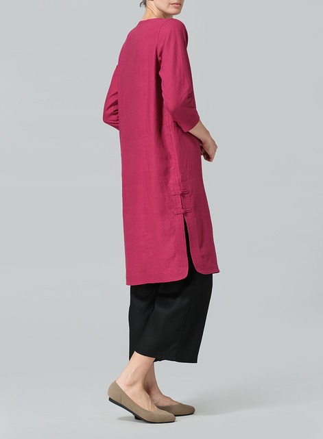 - Straight hemline sitting at the knee with handmade knot at side slits