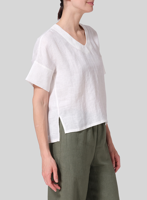 Linen Sloped Shoulder Wide Boxy V-neck Top