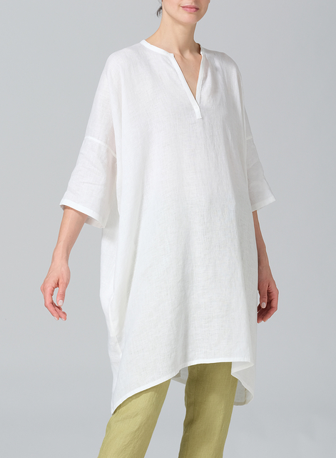 Linen Wide A-line V-neck Mandarin Collar Tunic