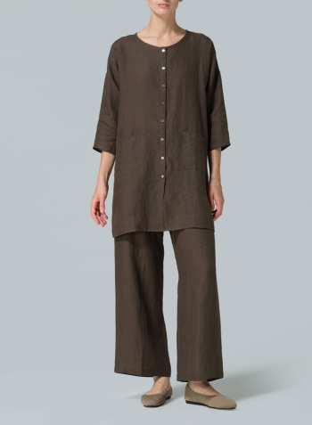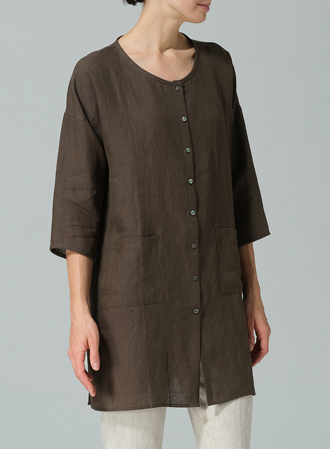 Linen Round Neck Button Front Top