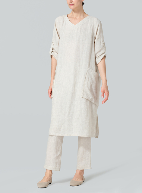 Oat Linen A-shape Patch Pockets Tunic Dress Set